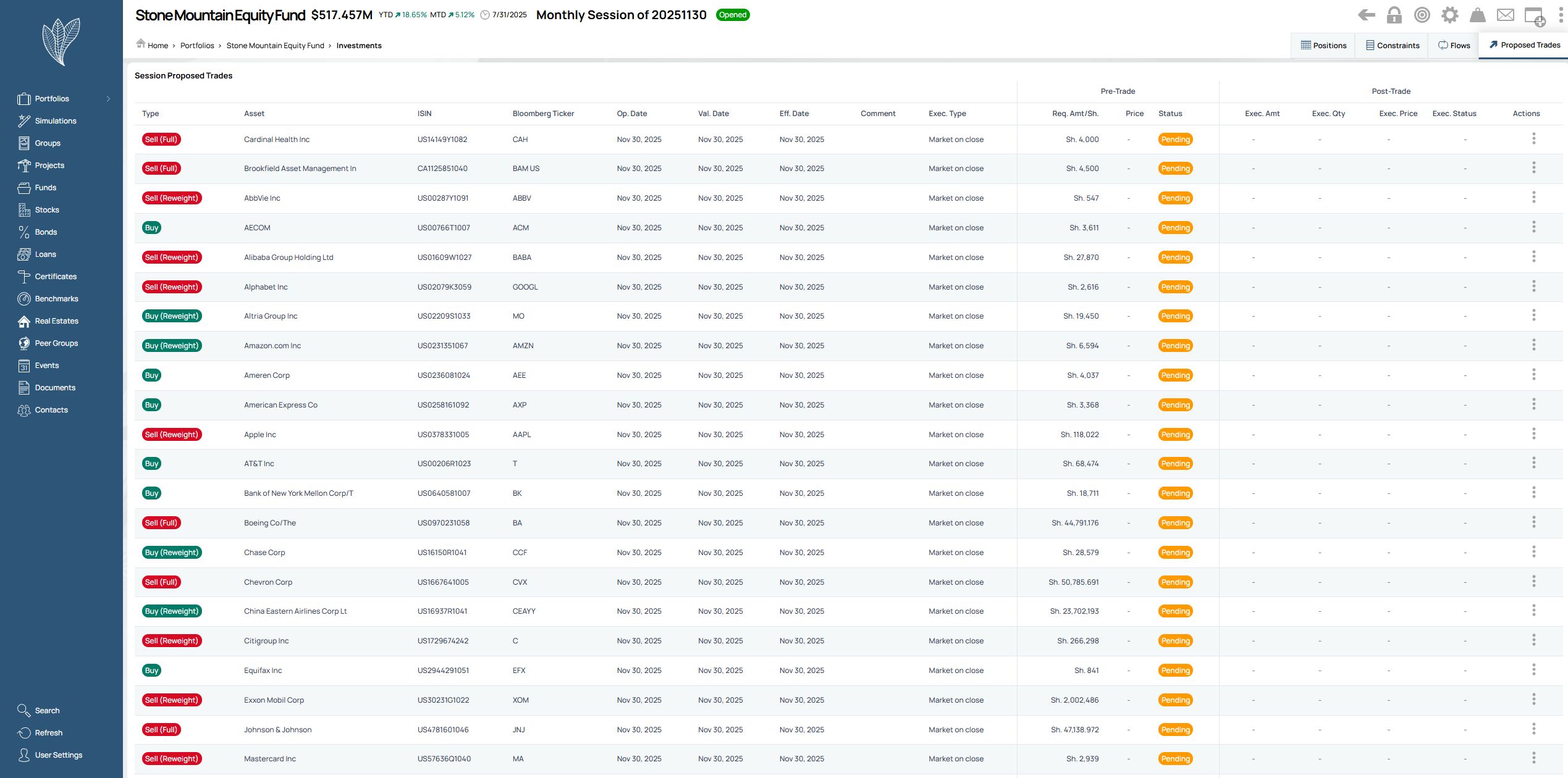 Préparez-vous à l'avenir grâce à de puissantes informations « what-if ». Modélisez le rééquilibrage du portefeuille avec des outils de scénario avancés. Comprenez les impacts potentiels sur la liquidité, la valeur nette d'inventaire et les expositions avant qu'ils ne se produisent.