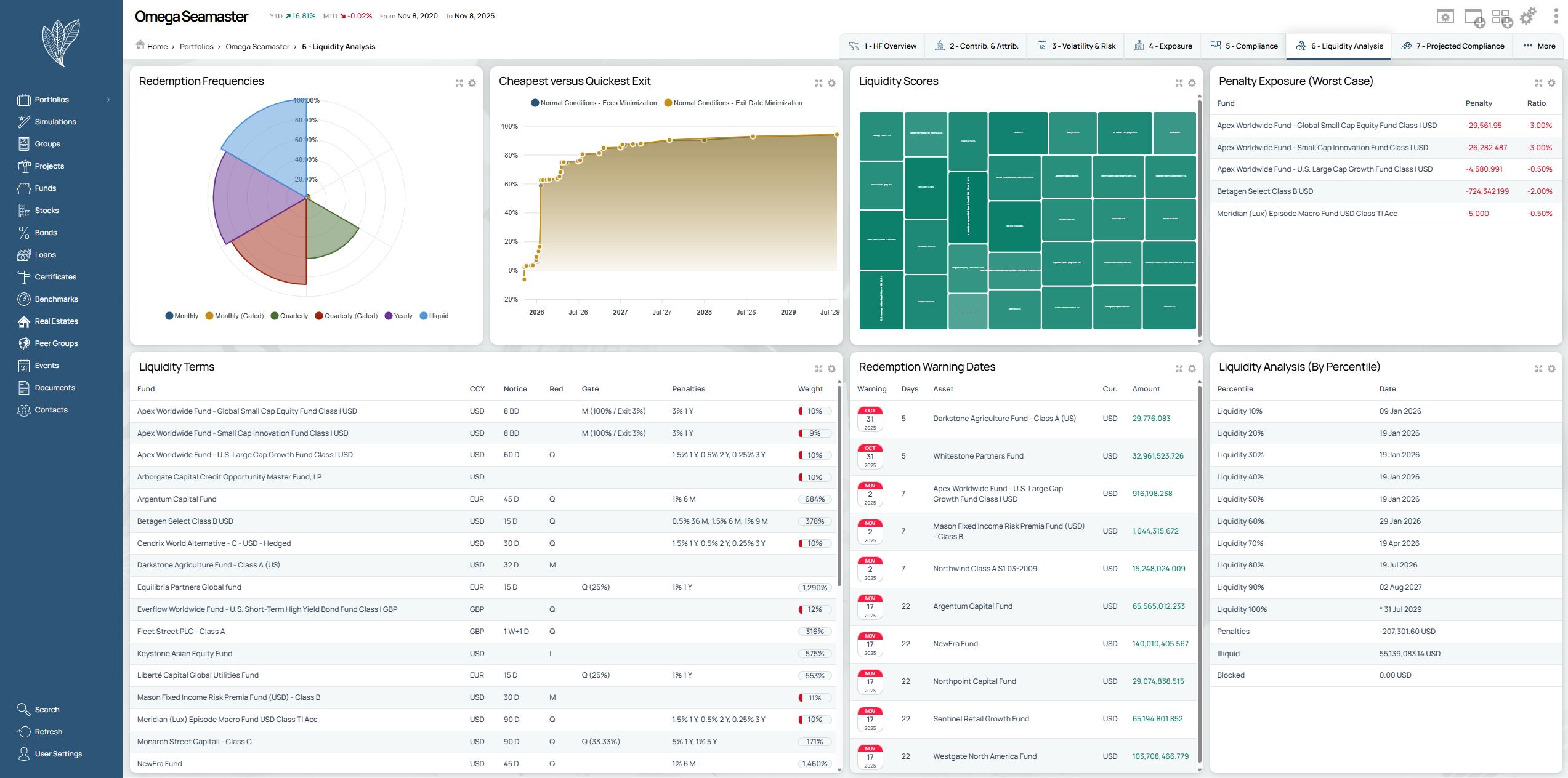 Les gestionnaires de portefeuilles s’appuient sur des outils avancés pour les projections de flux de trésorerie, le rééquilibrage et les simulations d’investissement. La plateforme permet l’optimisation, les back-tests et les scénarios hypothétiques avec vérifications de conformité pré-négociation. L’analyse de liquidité et de transparence fournit des insights clairs sur l’exposition. Côté back-office, elle gère la VNI, le TRI et les multiples PE, automatise les calculs de frais et consolidations de portefeuilles, et assure la traçabilité grâce au stockage électronique de documents.